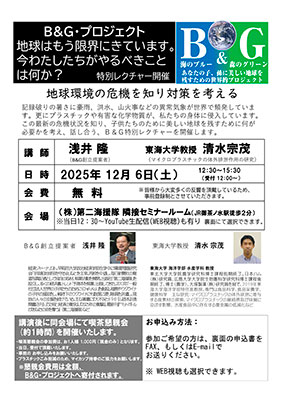 | 12月6日(土)に東京(お茶の水)で説明会(無料)を開催します。 環境問題に興味のない人も、これを機会にぜひご参加ください。 現状を知ることから始めていただきたいのです。 ご参加いただける場合は、人数を事前に把握したいので必ず登録をしていただきたいです。 この地球のためにも、皆様のご参加を心よりお待ち申し上げております。 当日の模様は、オンラインでも視聴できます。 また「B&G・プロジェクト」のホームページでは、それ以外の活動も紹介しています。 お時間があるときにぜひご覧ください。 https://b-and-g.org/  |